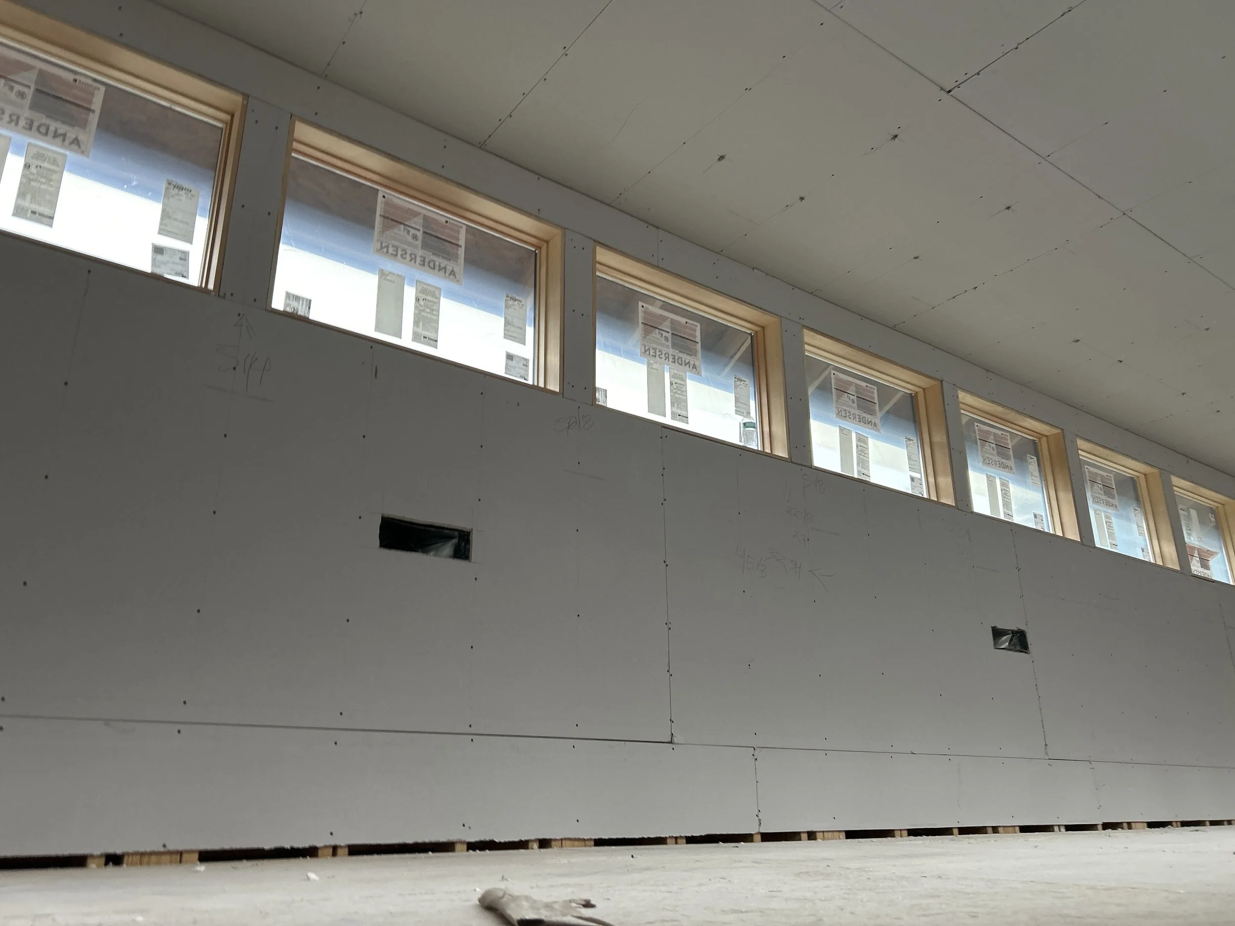 The drywall crew hung and finished the drywall in the upper clear story.